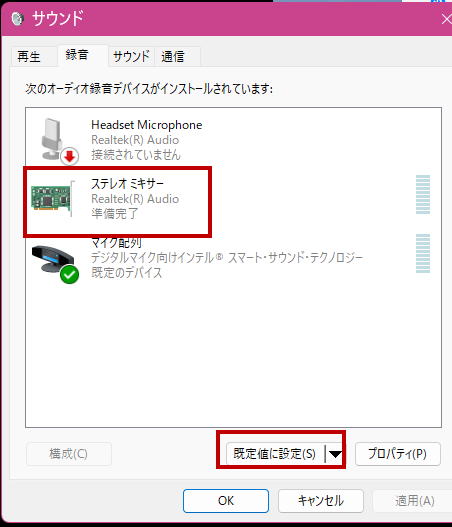 | Windows 10時代はボイスレコーダーという名前だったかな、 内部音声も録音できてたはず、でも、このサウンドレコーダーに変わってから、 ラジオの音声を録音しても音は出ない、できないという現象にあきらめてた。 オリンパスのボイストレックというレコーダーをわざわざ購入したけど、 なんか面倒くさい、電池がすぐなくなるし、音がいまいち気に入らない。 数日前にYouTubeを見てから、できるかもと希望を持ったけれど、 ボイスメーターをダウンロードして、サウンドの設定をへんこうして、どうのこうのと なんか、もう頭に入らなくなった。でも、あきらめなかった。 Windows 11にせっかく付随してるのに、使えないはずはないと。 要は「ステレオ ミキサー」を有効にして、パソコン内の音を録音する |