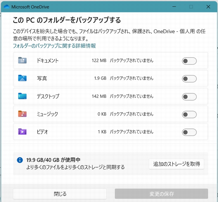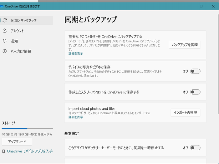 | 今はすべてオフにしたが、PCの設定時に、このうち、デスクトップとドキュメントがONに なっていて、ビルダーもバスターも知らずにインストールしていた。 インストールする前に気が付けばよかったけど・・・ まあ、こういうところが年を取ったということだろう。 最初から、すべてワンドライブにバックアップの設定で、 PCが届いたということだ。 |