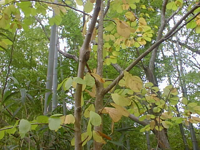 トウダイグサ科。山地に生え樹皮は灰白色でなめらか、葉は楕円形で先がとがる。光沢があり、裏面は緑白色。秋に美しく紅葉するとのことだがこの日はまだ、まだのようで、もっと寒くならないと紅葉しない。